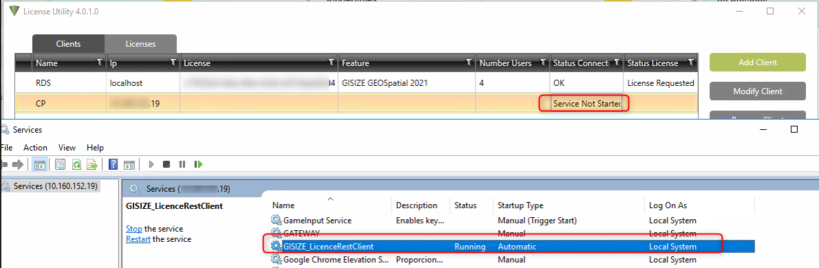 Se puede dar la situación en que el servidor de GISIZE no detecta la licencia, aunque tener en el equipo cliente el servicio "GISIZE_LicenseRestClient" corriendo: