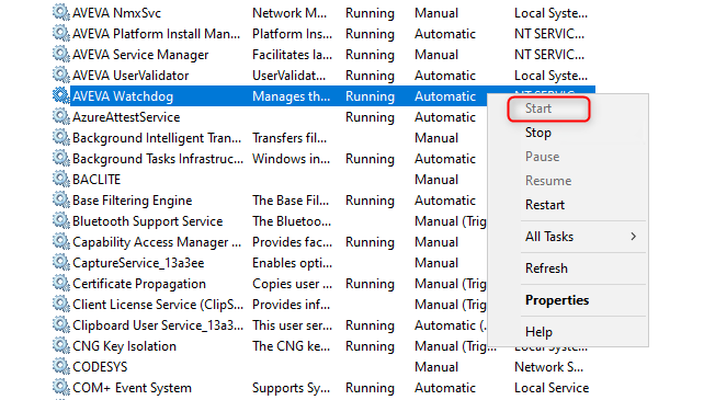 2. Haga clic en AVEVA Watchdog Service para ver su estado.