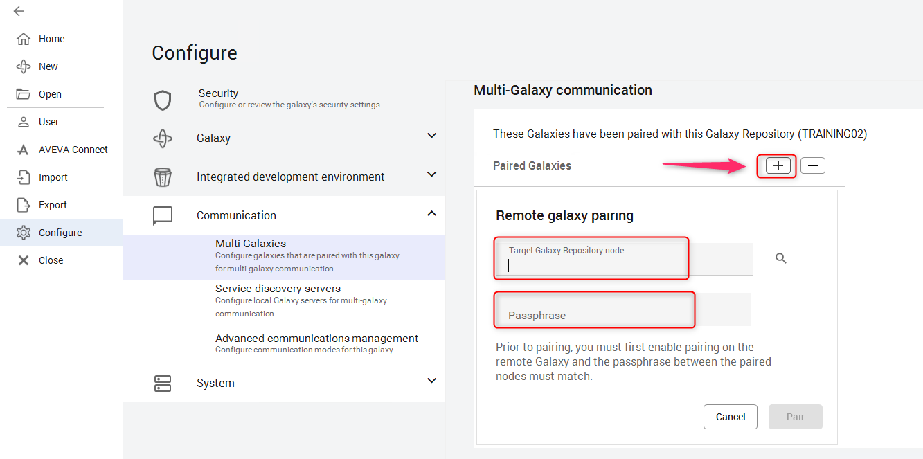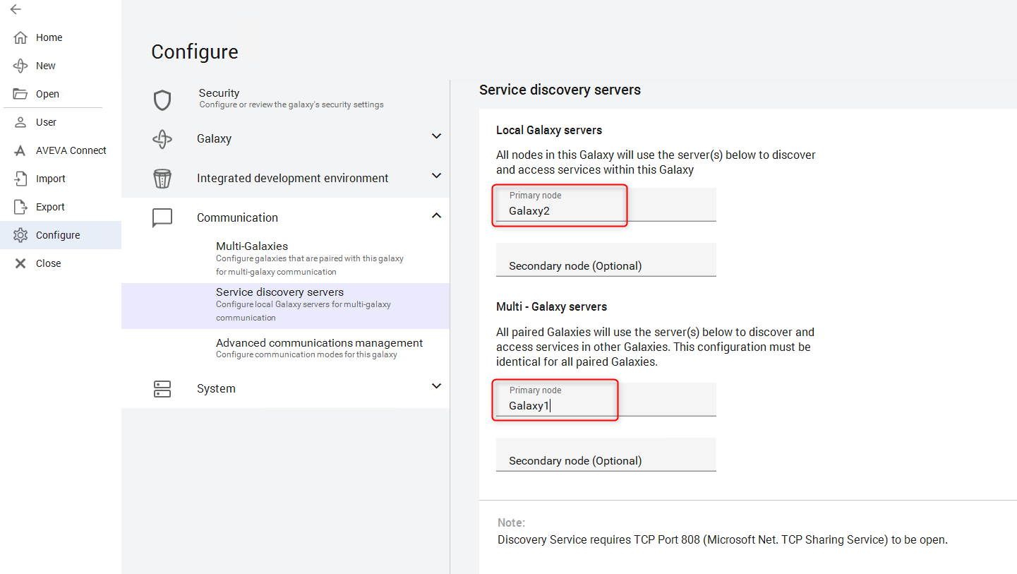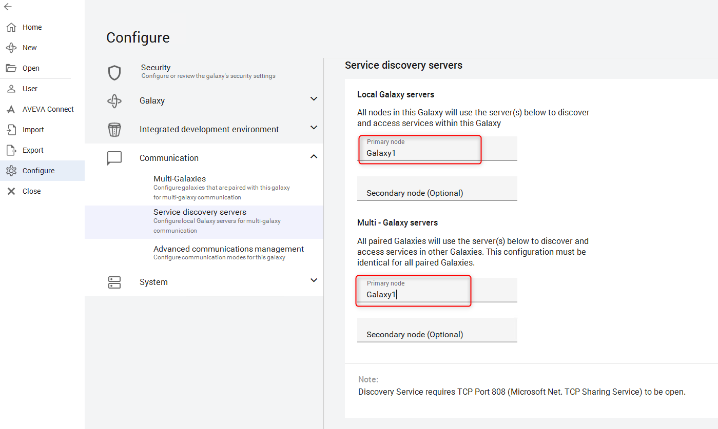Información: Por defecto, el nodo primario de Local Galaxy Server nodo primario y el nodo primario de Multi-galaxy Server no están configurados (en blanco), y deben ser configurados antes de habilitar el emparejamiento de galaxias.