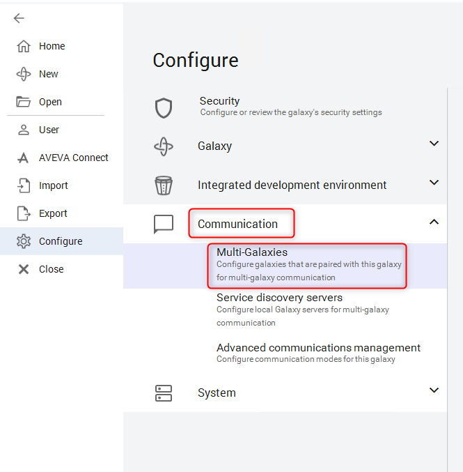2. Seleccione Communication y, a continuación, Multi-Galaxies para abrir la configuración.