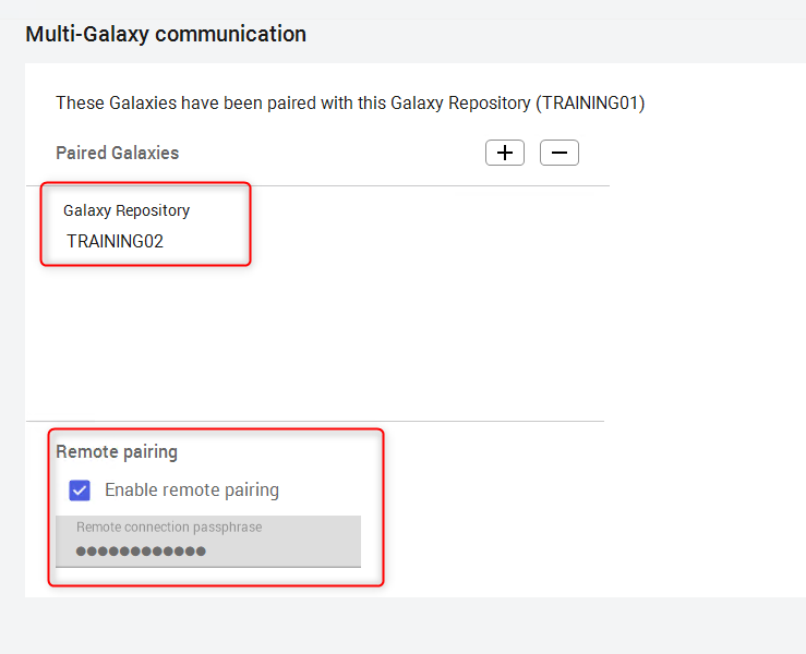 3. Verifique o configure el apartado Local Galaxy servers y Multi-Galaxy servers como un nodo GR, en este caso ambos deben ser el mismo. (Ej: El ejemplo cuenta con un entorno multi-galaxia con dos galaxias Galaxy1 (TRAINING01) y Galaxy2 (TRAINING02)).