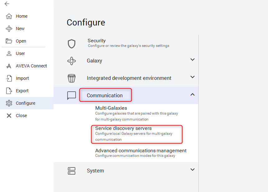 2. Seleccione Communication y, a continuación, Service discovery servers.