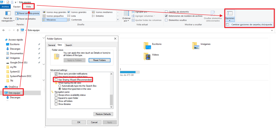 7. Configuración de Windows – Folder Options, dejar en blanco la casilla “Use Sharing Wizard”