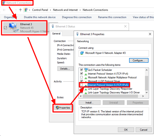 Desde la ruta indicada en la siguiente imagen, desmarcando la casilla (TCP/IPv6):