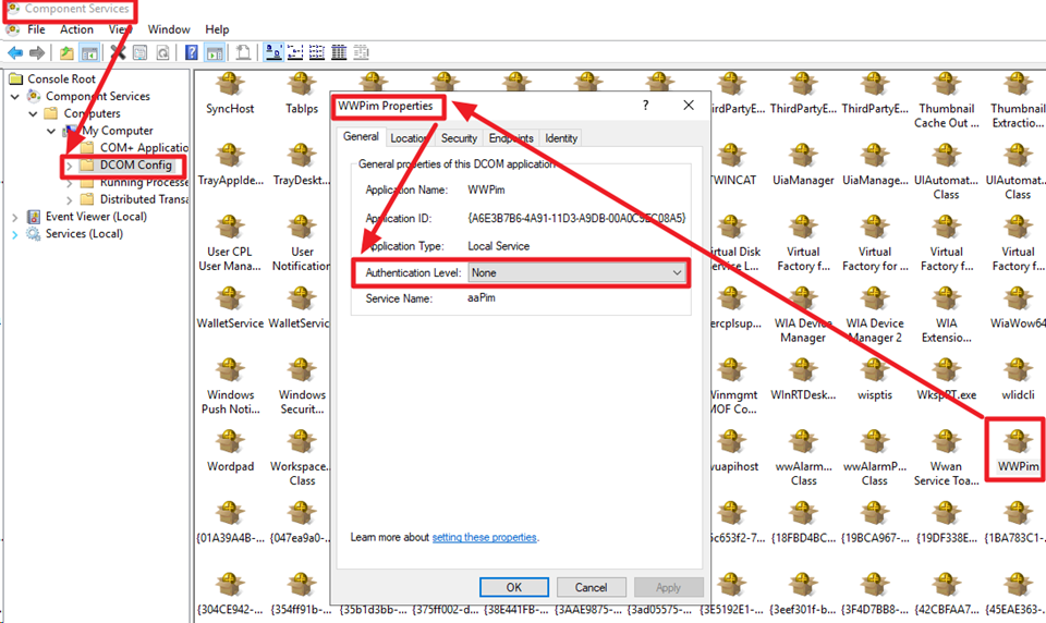 Asegurarse que el Authentication Level se encuentre en None buscando Components Services en Windows y entrando a WWPim.