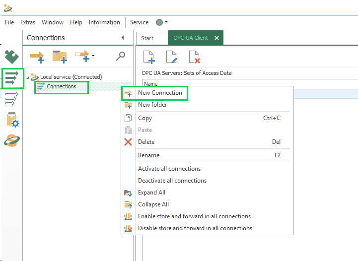 Así que vamos a la sección "Connections" de la configuración de OPC Router, hacemos clic con el botón derecho del ratón en "Connections" (debajo de "Local Service") y seleccionamos "New Connection" en el menú.