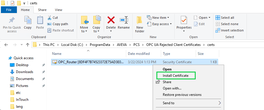 Para solucionar esto, en la máquina desde dónde nos conectamos a la galaxia de System Platform, debemos navegar hasta C:\ProgramData\AVEVA\PCS\OPC UA Rejected Client Certificates\certs donde encontramos el certificado .der para OPC Router.