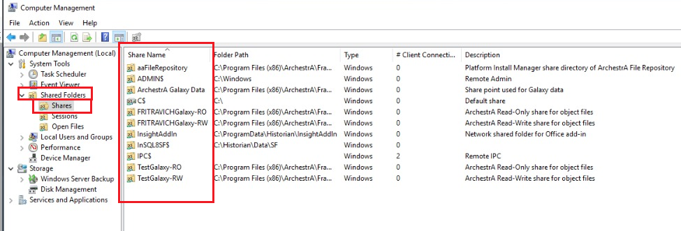 3) Dentro del Computer Management, dirigirse a Shared Folders > Shares, donde se encontrarán todos los procesos compartidos del servidor local con los remotos.